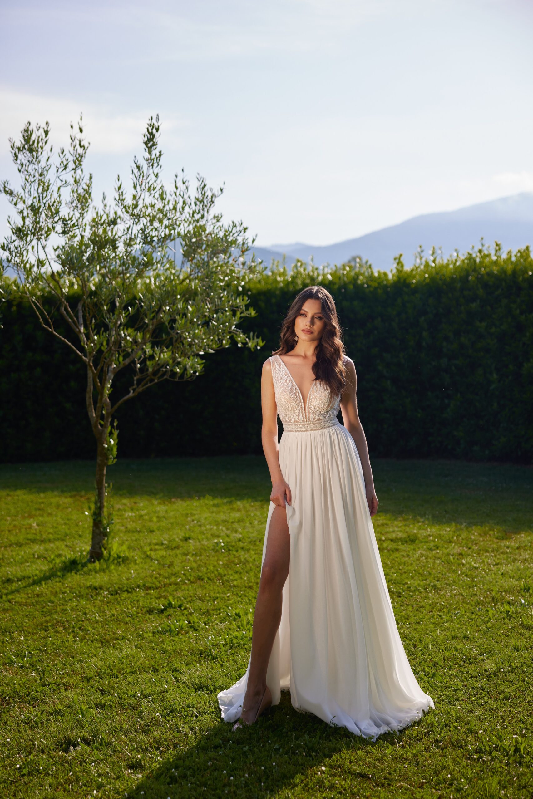 Kreemjast pehmest atlaskangast, sügava ja elegantse V-kaelusega, naiselik pulmakleit Virginia, mida ehib julge lõhik seelikuosas. Õlapaelad toovad kleidile veelgi rohkem elegantsi. Sügav V-kaelus täiendab üldist romantilist stiili. Korsett toetab pruudi figuuri, rõhutades talje ja lisades kleidile naiselikku joont. Šikk lõhik kleidi esiosas lisab sarmi ja kaasaegset puudutust. Lõhik võimaldab pruudil liikuda vabalt ja elegantse graatsilisusega. Samuti pakub see võimalust paljastada õrnalt pruudi jalgu, luues samal ajal elegantse ja sensuaalse efekti. Satiinseelik lisab kleidile klassikalist võlu ja elegantsi.