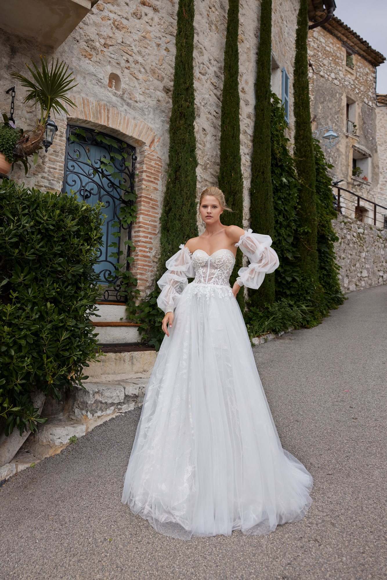 Pulmakleit on tõeline unistuste kleit, kombineerides endas mitmeid võluvaid elemente. Läbipaistev korsett annab kleidile kaasaegse ja sensuaalse noodi, paljastades õrnalt pruudi figuuri. Korsetti kaunistavad õhulised tikandid ja pitsid, mis lisavad kleidile naiselikku peenust ja romantilist hõngu.Puffvarrukad loovad pulmakleidile dramaatilise efekti, tuues esile pruudi õhulise elegantsi. Varrukad pakuvad ka praktilist mugavust, võimaldades lihtsat liikumist.