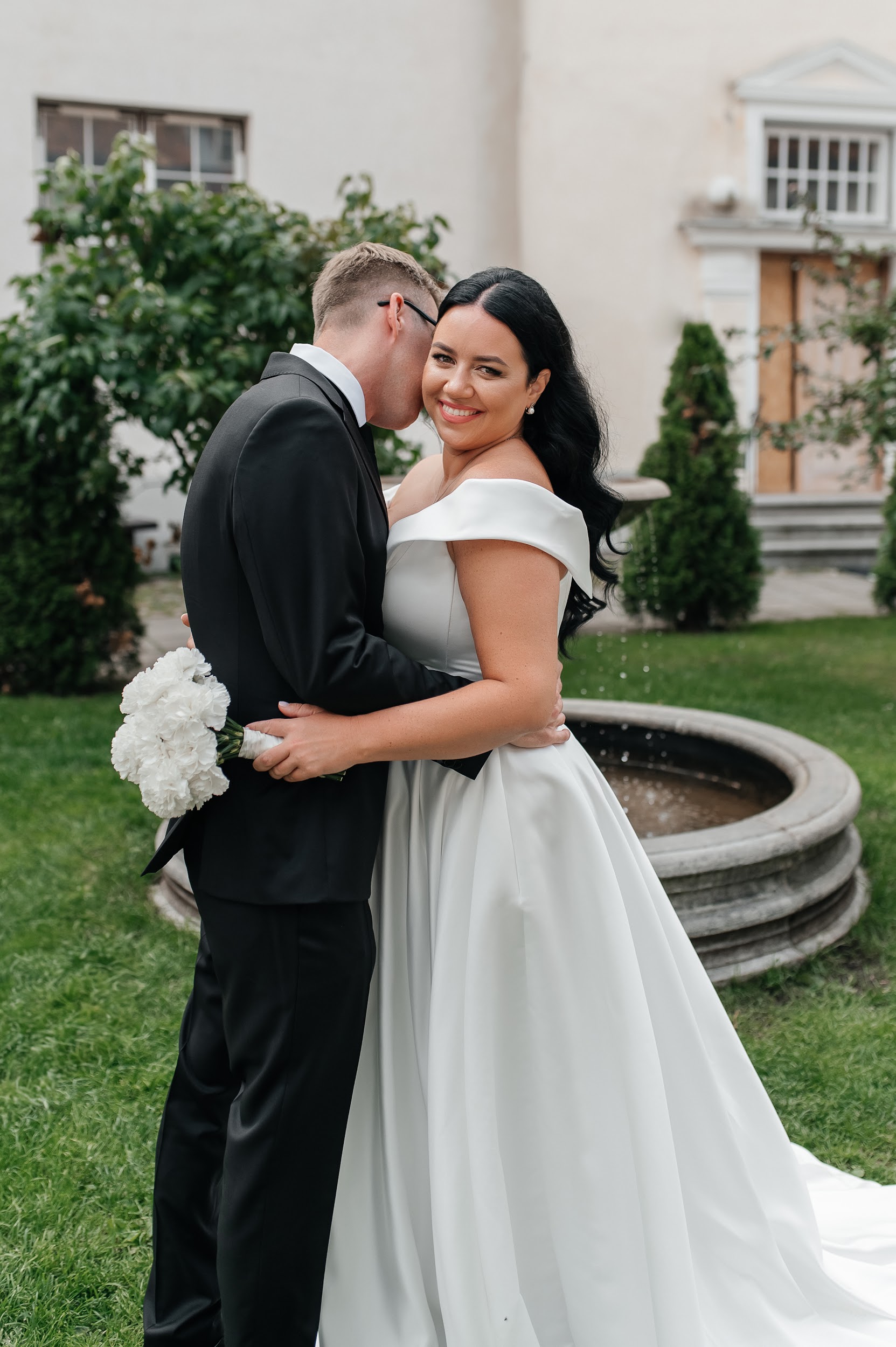 Pruut Maarja säras oma pulmapäeval atlasest pulmakleidis Holly. Luksuslik kangas langes täiuslikult, lisades igale sammule kerge lummuse.Fotograaf: M.Baskevits